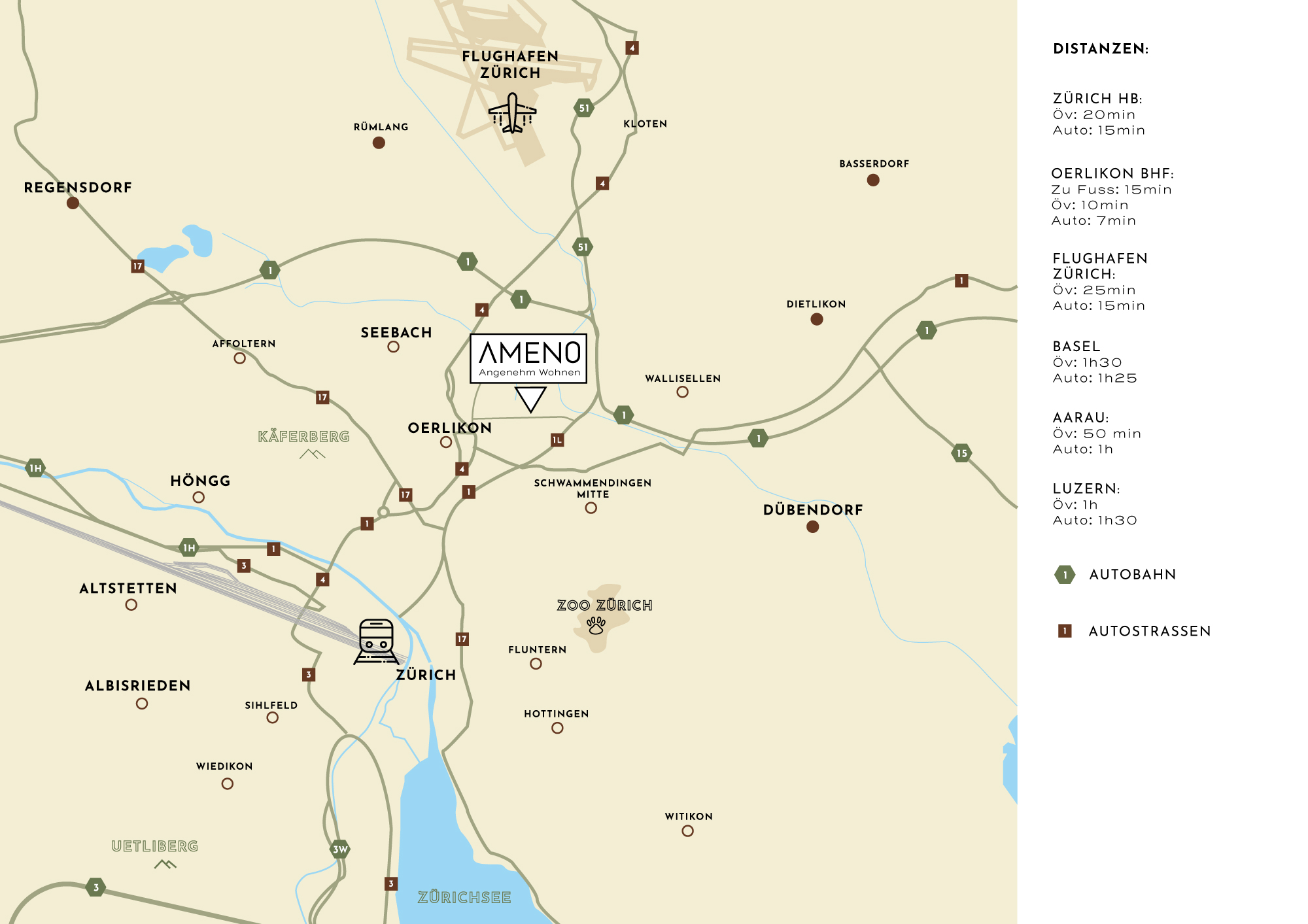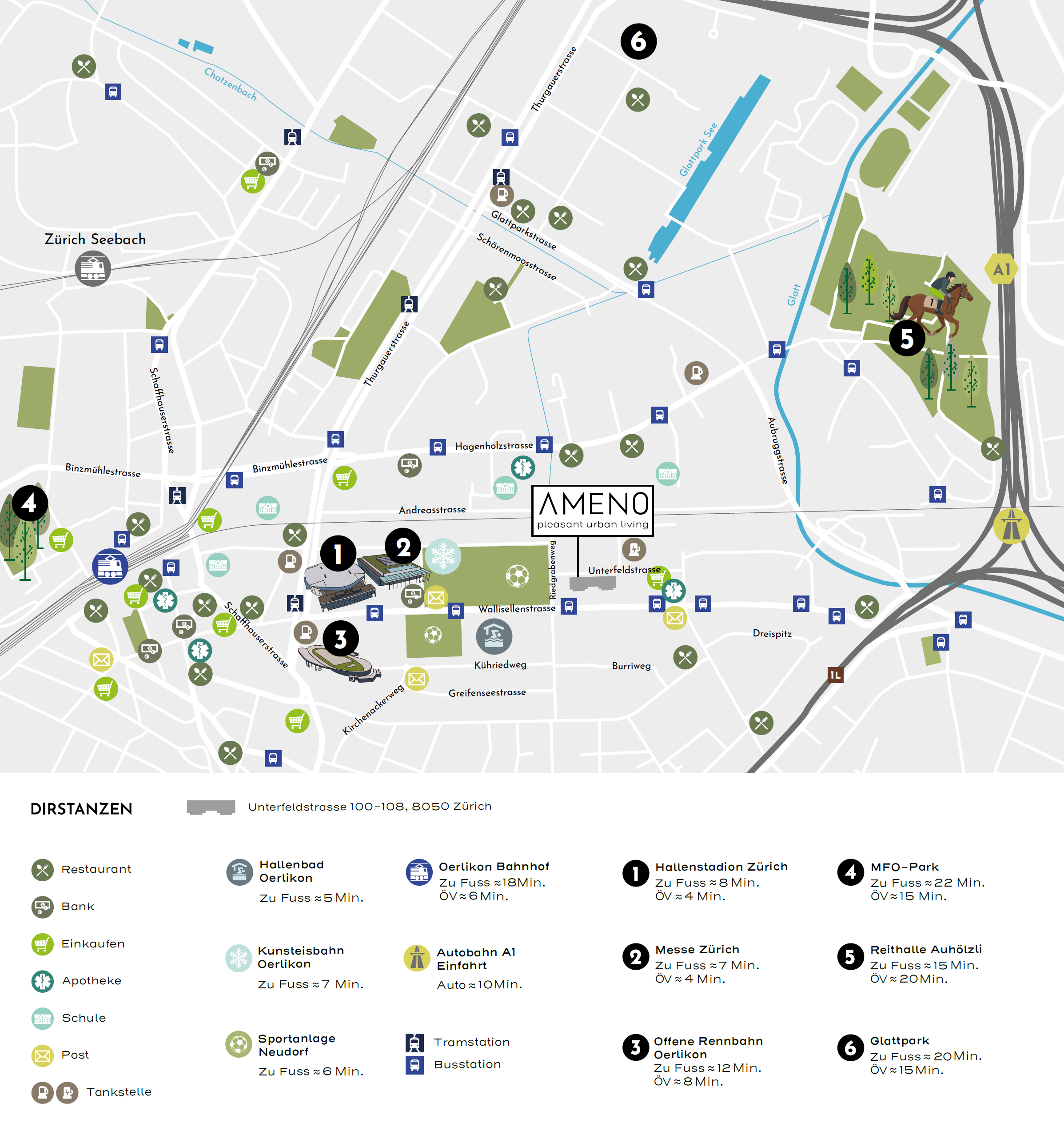Der Bus ab der nur wenige Schritte entfernten Haltestelle bringt Sie in 7 Minuten direkt zum Bahnhof Oerlikon. Von dort erreichen Sie den Zürcher Hauptbahnhof in rund 10 Minuten und den Flughafen in nur 5 Minuten – ideal für Berufspendler, Vielreisende und Nachtschwärmer. Dank der zentralen Lage von «Ameno» geniessen Sie volle Mobilität – auch ohne eigenes Auto. Für alle, die dennoch mobil mit dem eigenen Fahrzeug bleiben möchten, ist ebenfalls gesorgt: Die A1 ist in kurzer Zeit erreichbar und bietet Anschluss an Städte Aarau, Basel oder Luzern.